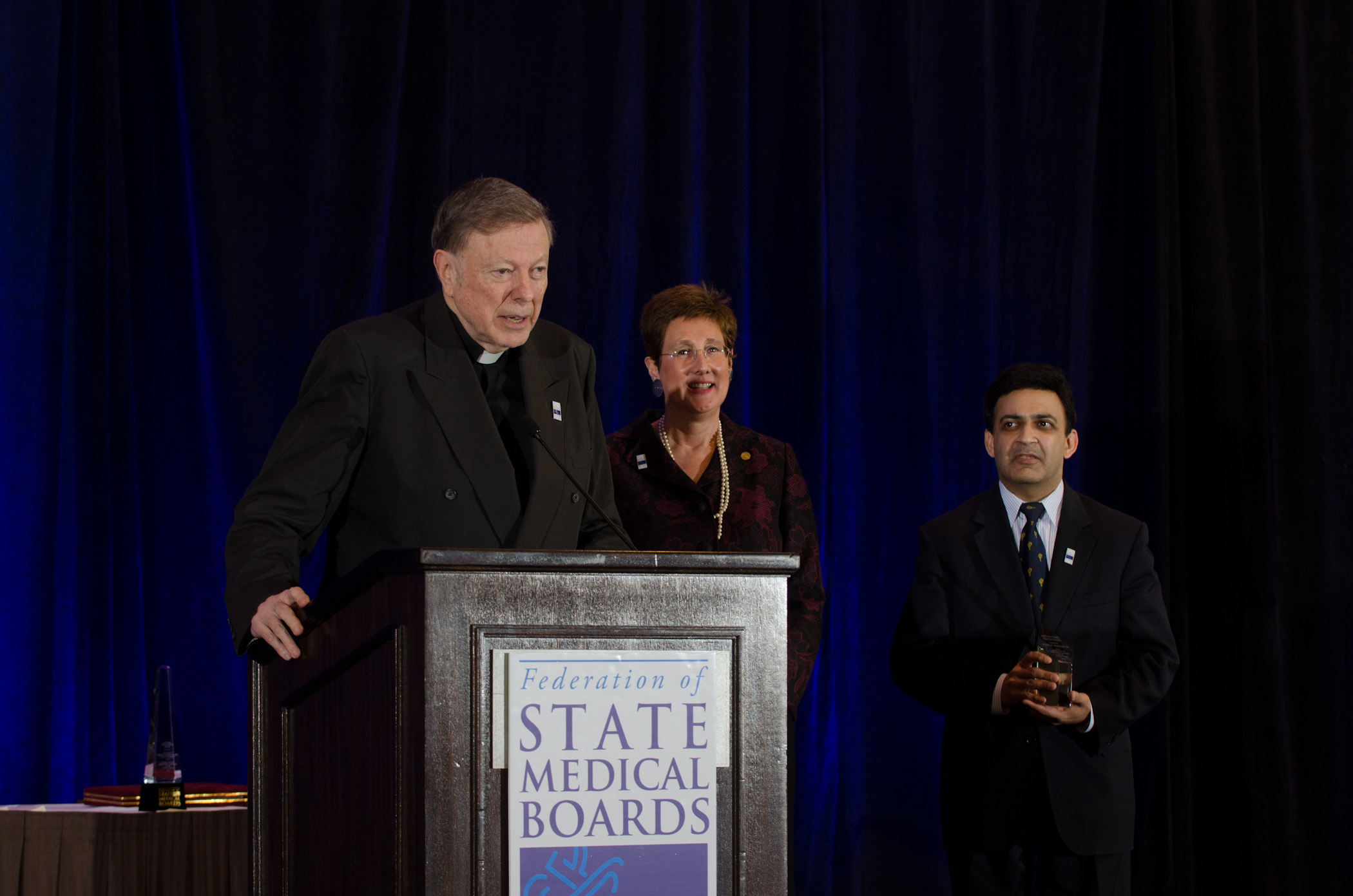Outgoing FSMB Treasurer Jim Andriole is recognized by newly-installed FSMB Chair Lance Talmage