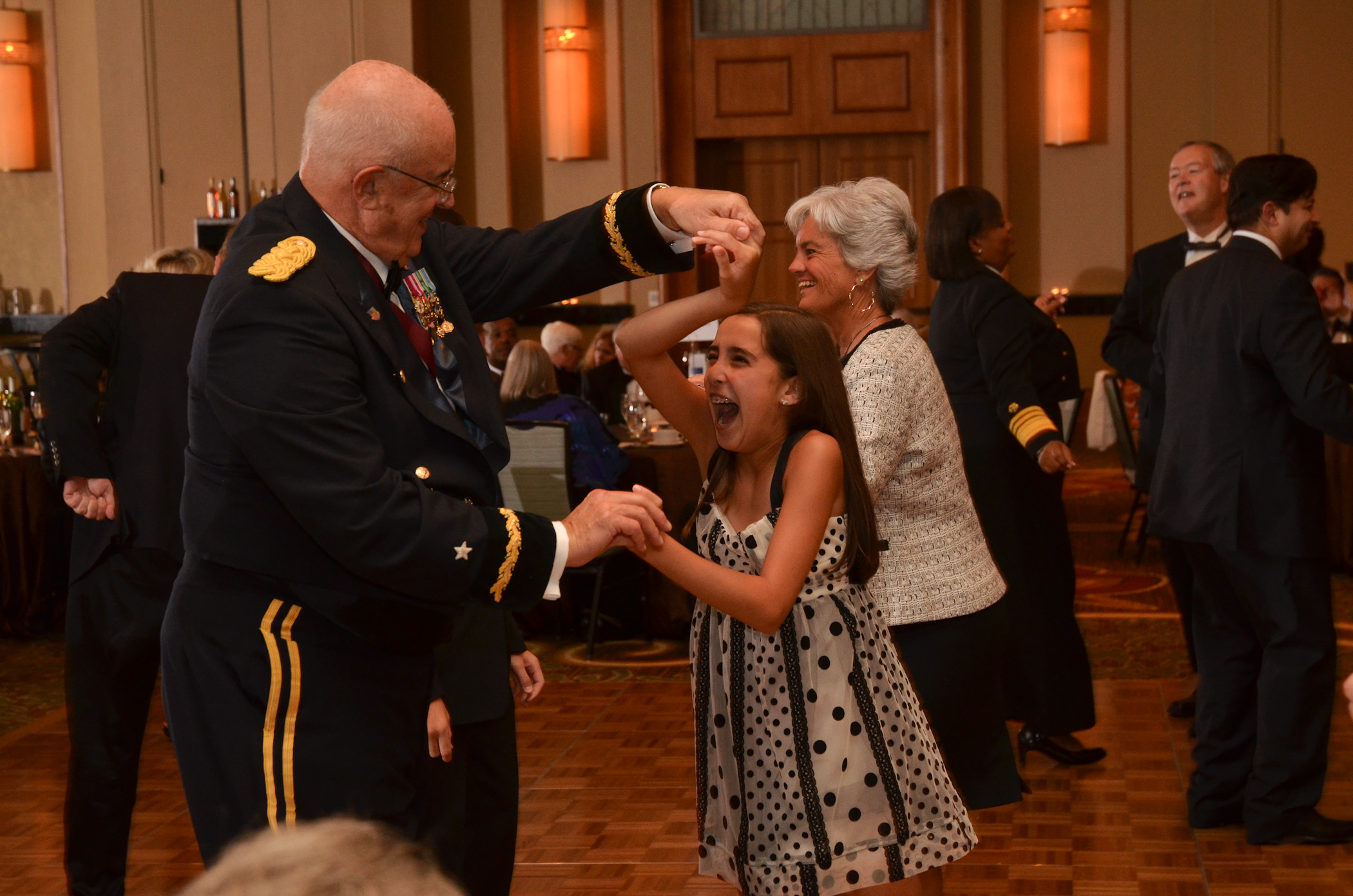 Dr. Talmage and his granddaughter enjoy a 'twirl' on the dance floor as part of the Bierring Dinner festivities