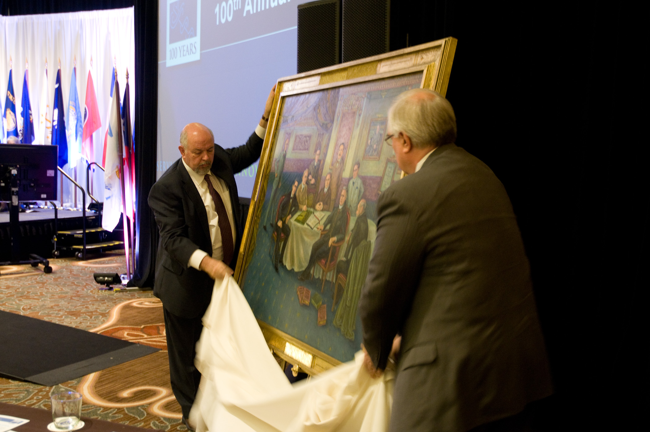 Drs. Emmanuel Cassimatis (left) and Donald Melnick (right) present the FSMB with a portrait memorializing the organization's founding