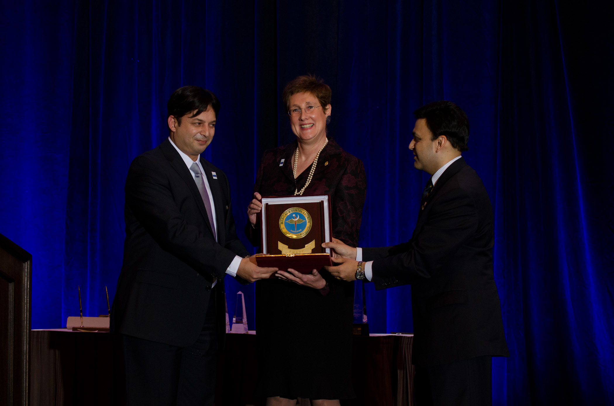 Drs. Rhyne and Chaudhry accept a commemorative plaque from one of the FSMB affiliate member boards